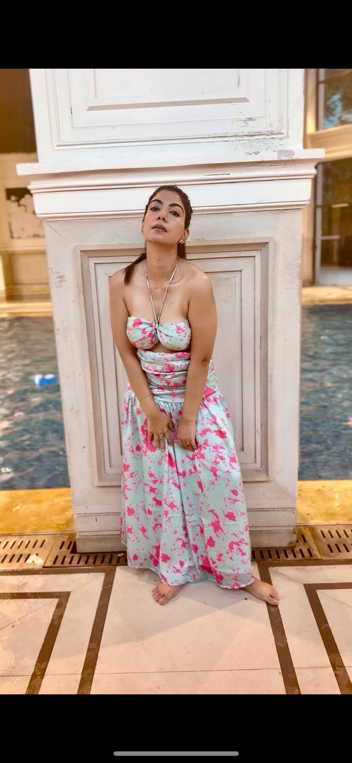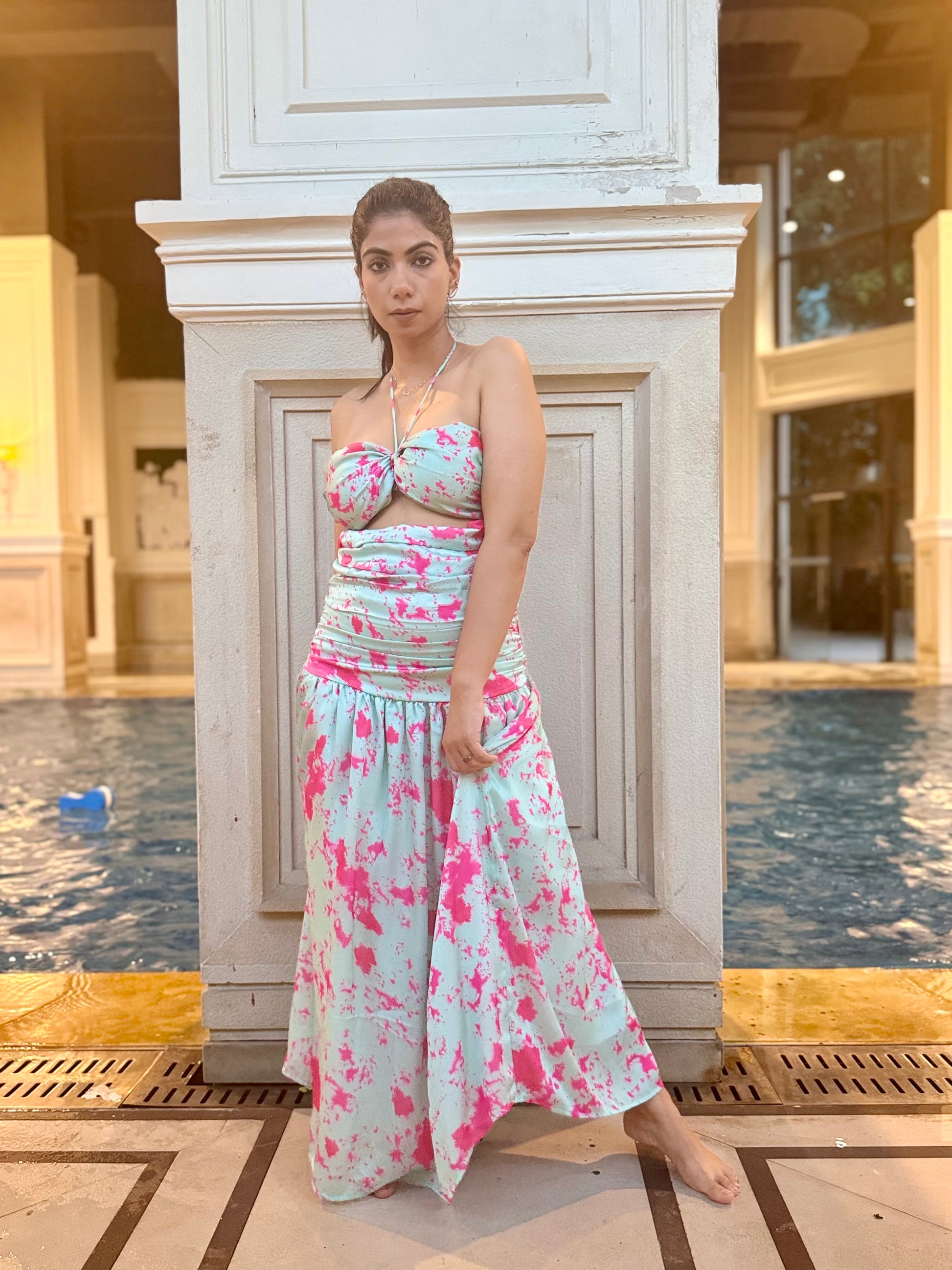 Step into the spotlight in this stunning mint green maxi dress with hot pink tie-dye and bust-waist cutout detail. The tie-dye pattern creates a psychedelic, artistic effect, while the cutout detail adds a touch of edginess and allure. The flowy maxi length creates a dramatic silhouette, and the bold color combination is sure to turn heads. Pair it with statement accessories for a chic, eye-catching look.