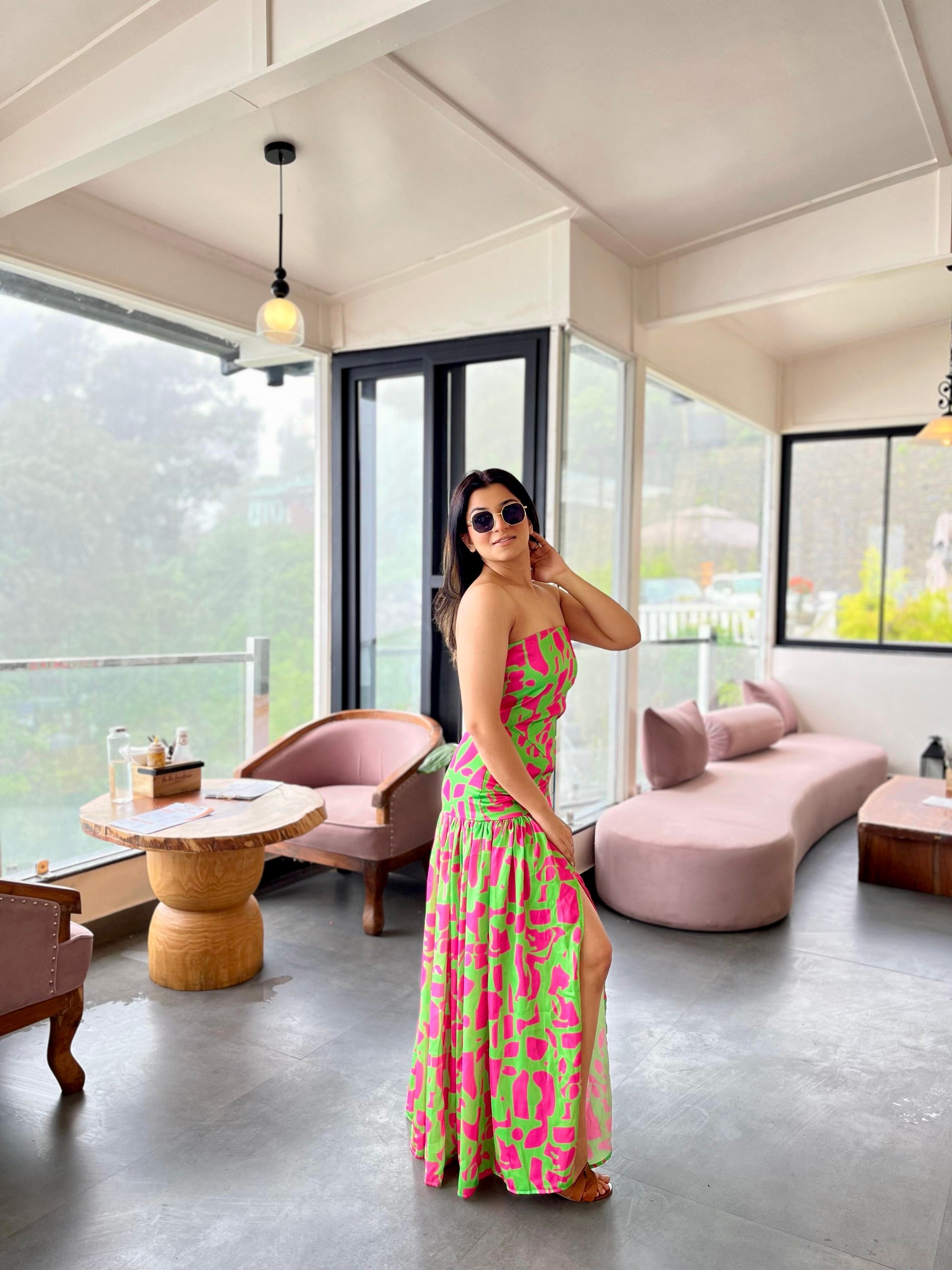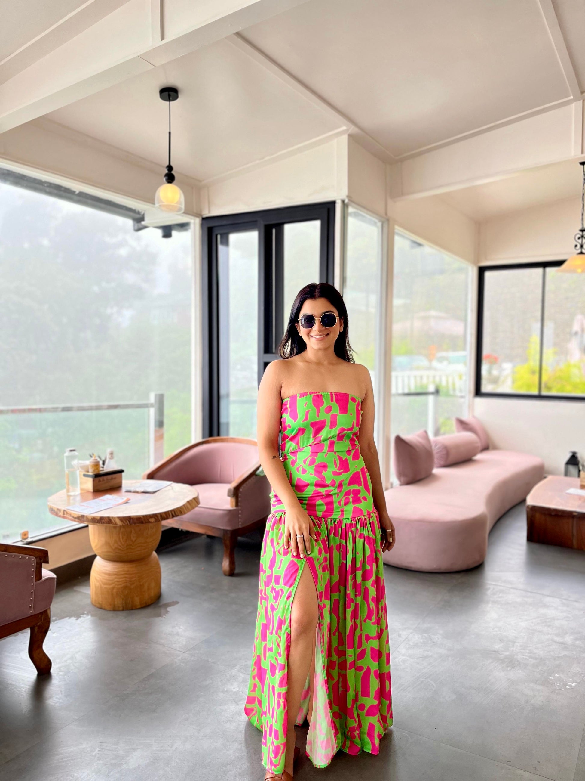 Get ready to slay the summer nights in this stunning Kelly green and Barbie pink ruched tube maxi dress with a slit. The vibrant color combination is bold, playful, and utterly Instagram-worthy, while the ruched detail adds texture and visual interest to the design. The tube style provides a comfortable, strapless fit while the maxi length creates a flowy, elegant silhouette & the slit adds a touch of sultry sophistication, making this dress perfect for a night out with friends, a summer concert, or a special occasion.Whether you're dancing the night away or posing for photos, this dress is sure to make you feel like a queen.