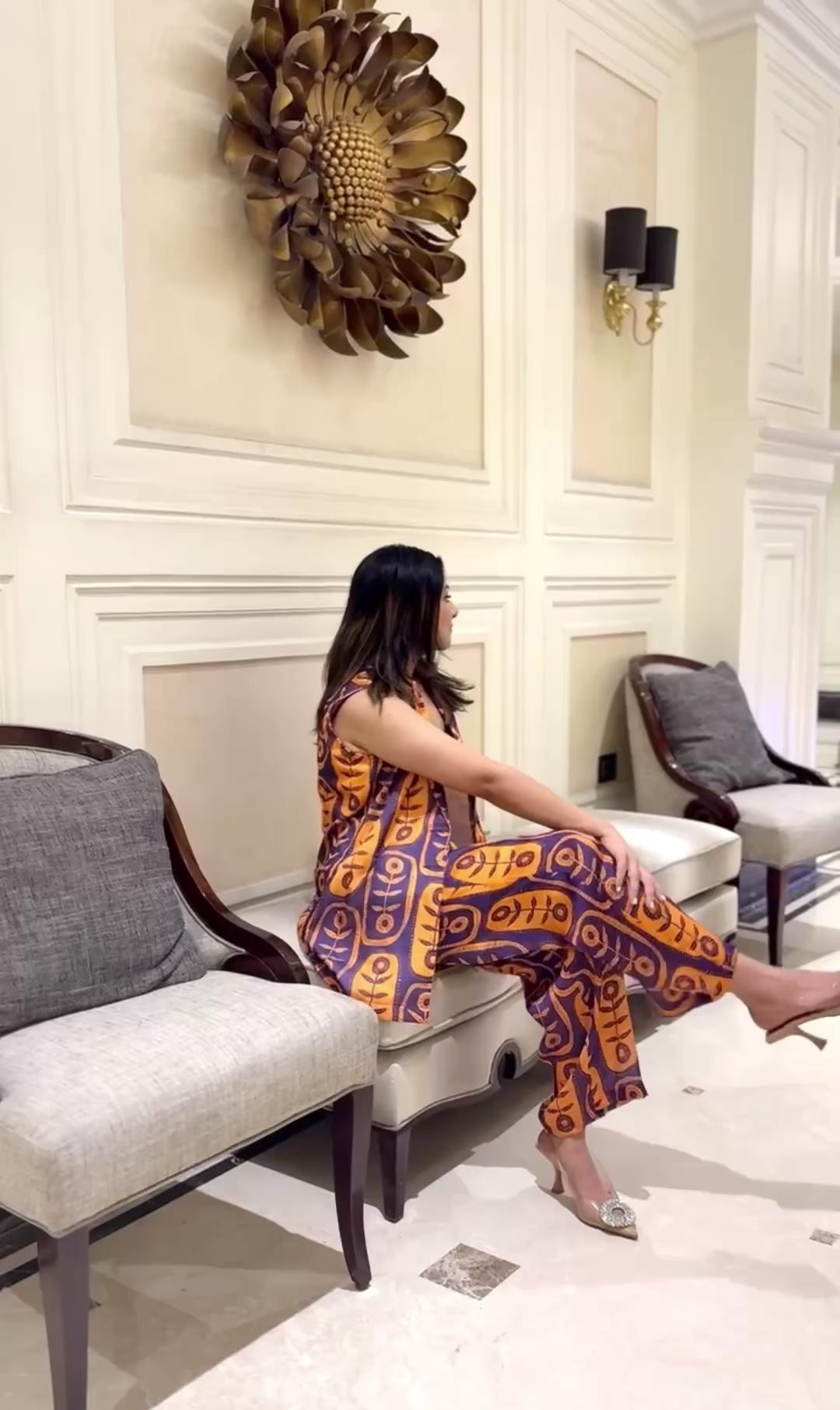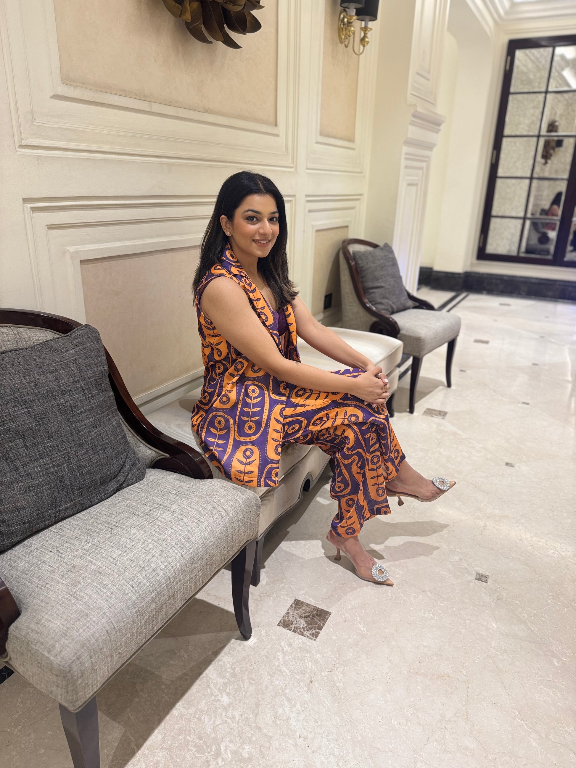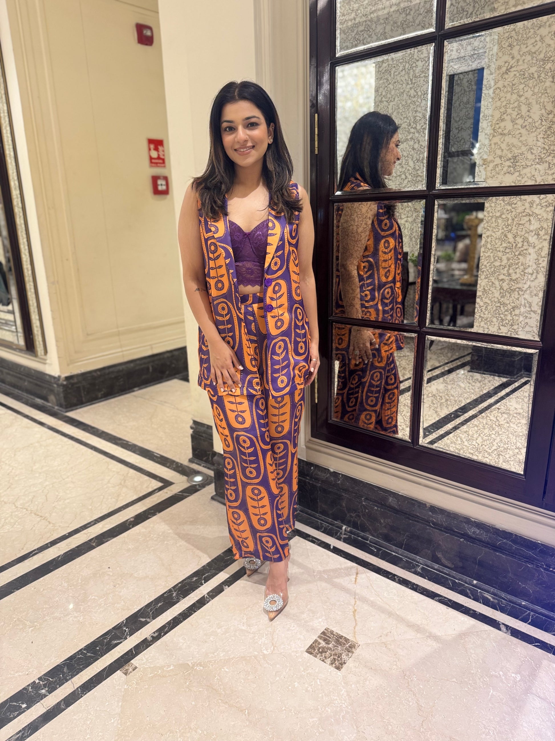 Make a statement with this vibrant purple and orange coord set, perfectly blending bold hues for a stylish look. The contrasting colors create a striking combination, ideal for those who dare to be different.