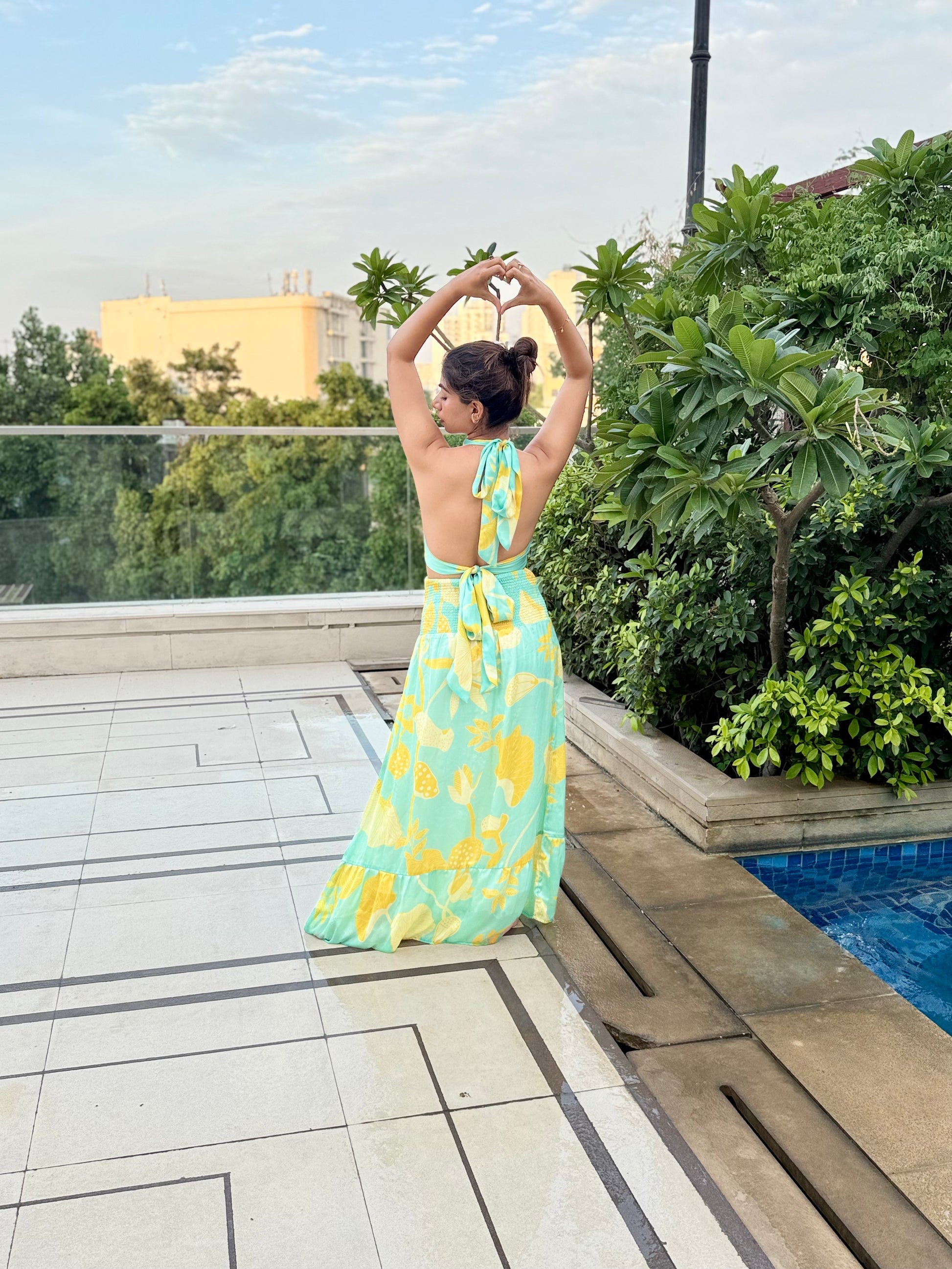 Get ready to bloom into style with this gorgeous two-piece pale turquoise and yellow floral print set. The backless top is perfect for showing off your tan, and the flowy skirt creates a beautiful, ethereal effect. The pale turquoise and yellow color combination is bright, cheerful, and perfect for summer. Whether you're heading to a garden or pool party, a summer wedding, or a beach vacation , this outfit is sure to make you feel like a flower in bloom.
