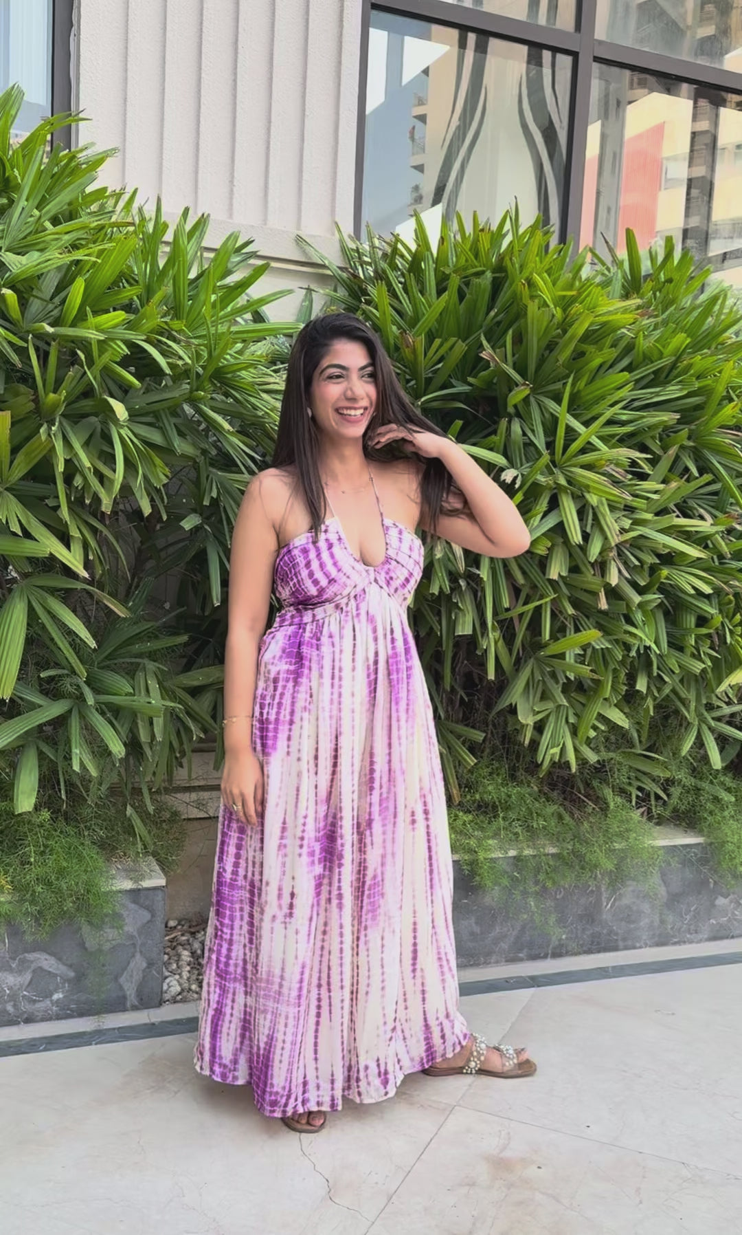 Unleash your inner bohemian with this breathtaking white and purple tie-dye halter neck dress. The mesmerizing tie-dye pattern seamlessly blends pure whites with deep, rich purples, creating a one-of-a-kind design that's both artistic and chic. The halter neck adds a touch of sophistication, while the flowy silhouette drapes elegantly, providing a sense of effortless style. Perfect for music festivals, outdoor gatherings, or stylish events, this dress embodies free-spirited elegance. Pair it with layered necklaces, sandals for a look that's truly unforgettable.